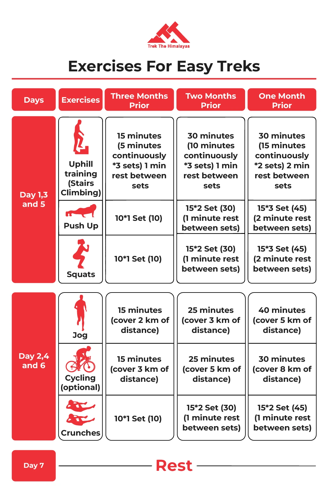 - Easy Range Treks - For the easy range of trek, the trekkers are advised not to put too much pressure on their bodies. Firstly, every trekker should start focusing on their fitness three months before going on the trek. Secondly, a few exercises that are a must-do for trekkers are - Uphill training, Push-Up, Squat on Day 1,3 & 5, then Jogging, Cycling & Crunches on Day 2,4 & 6. To know more about the ratio of the exercise as well as the duration, you can check the chart given below.